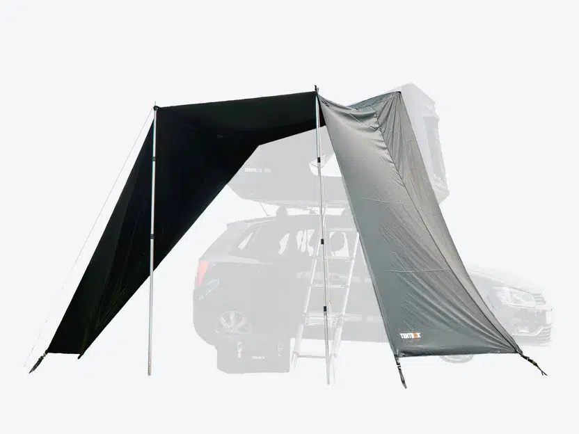Échelle couverte : Une fois installé, il crée un porche étendu pour votre TentBox qui couvre l’échelle, afin que vous puissiez vous sécher avant de monter à l’intérieur.