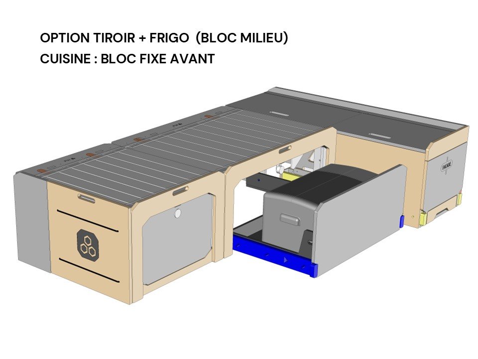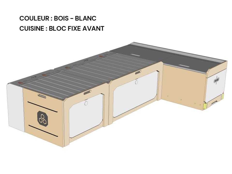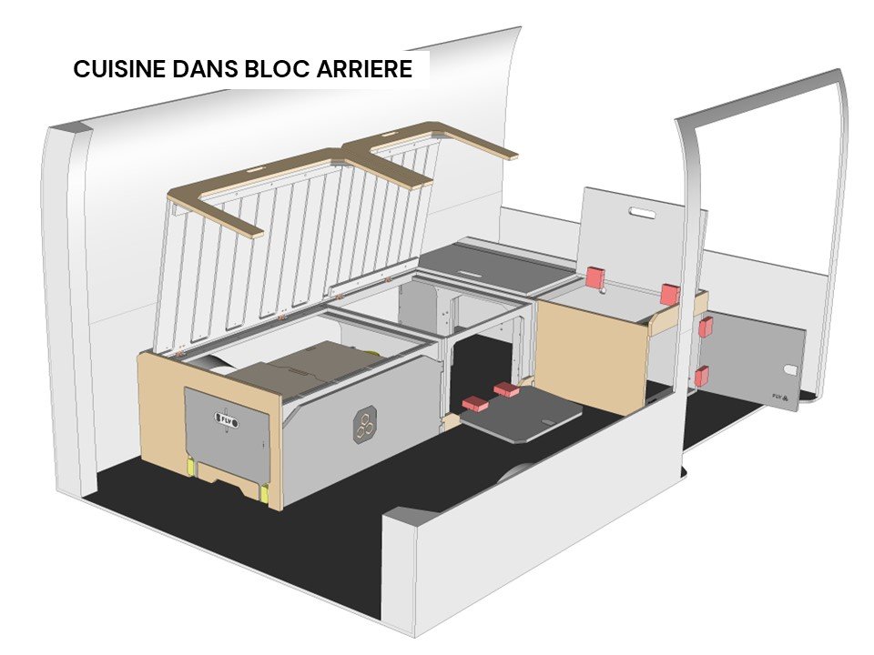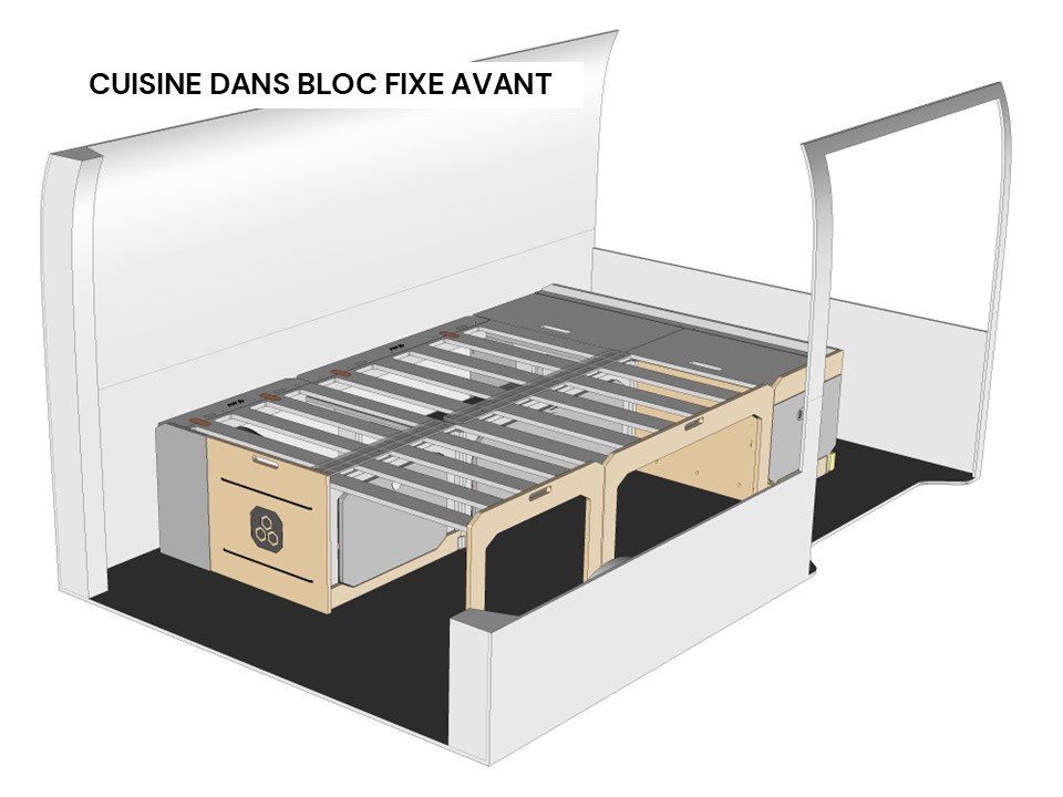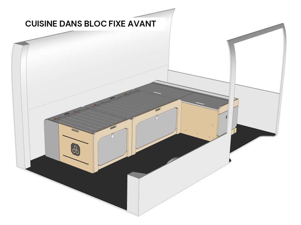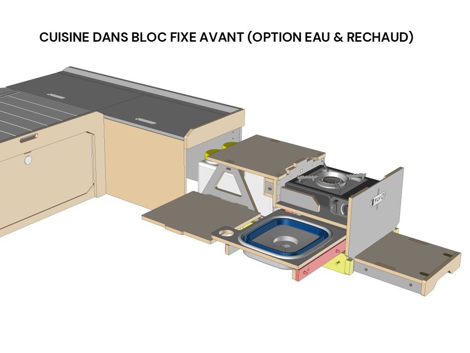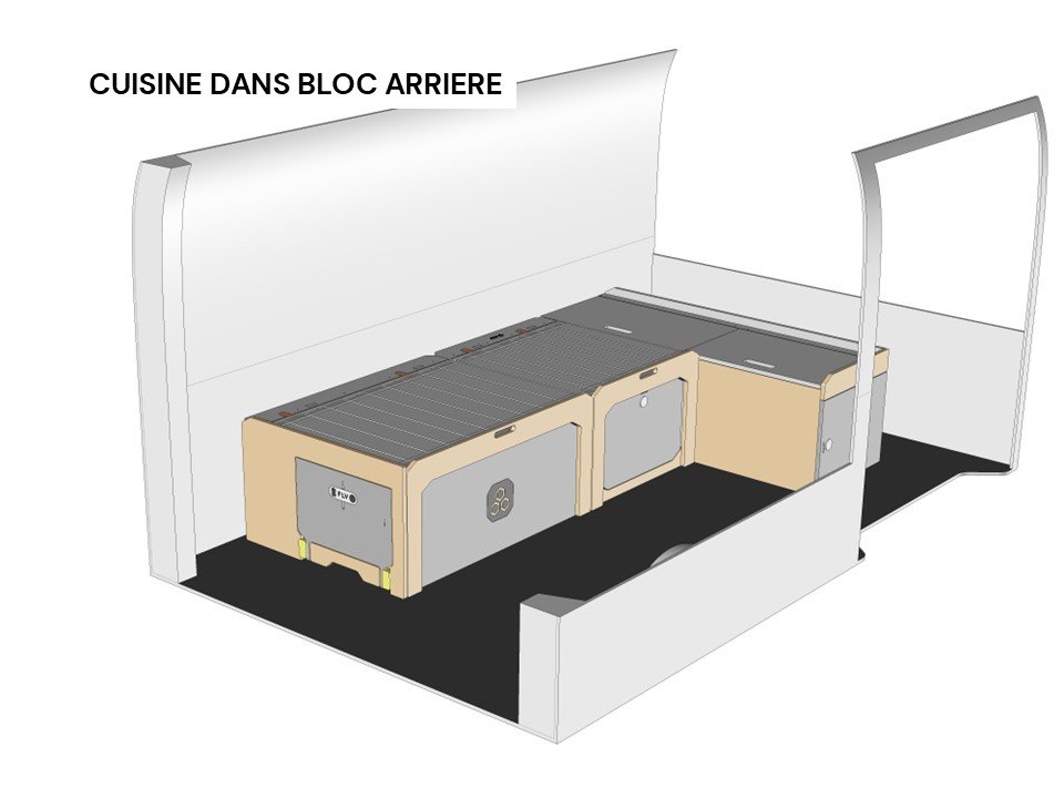 Ces options permettent de créer un aménagement complet : couchage + cuisine + eau + cuisson + froid