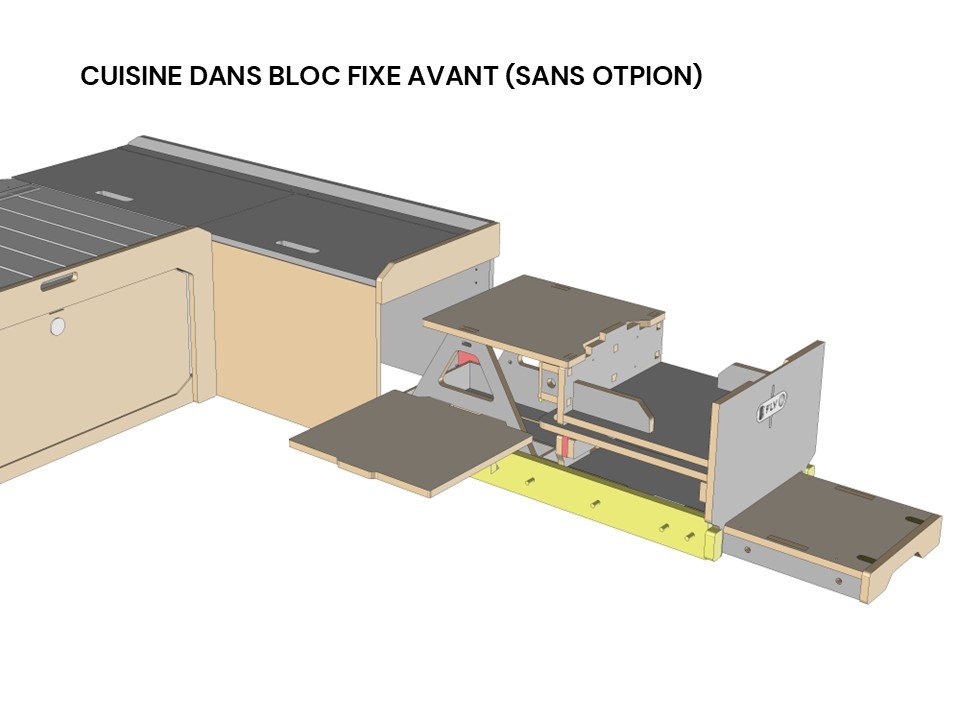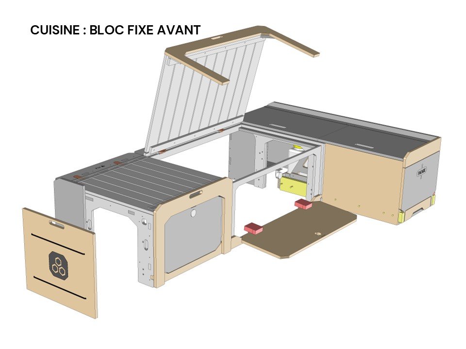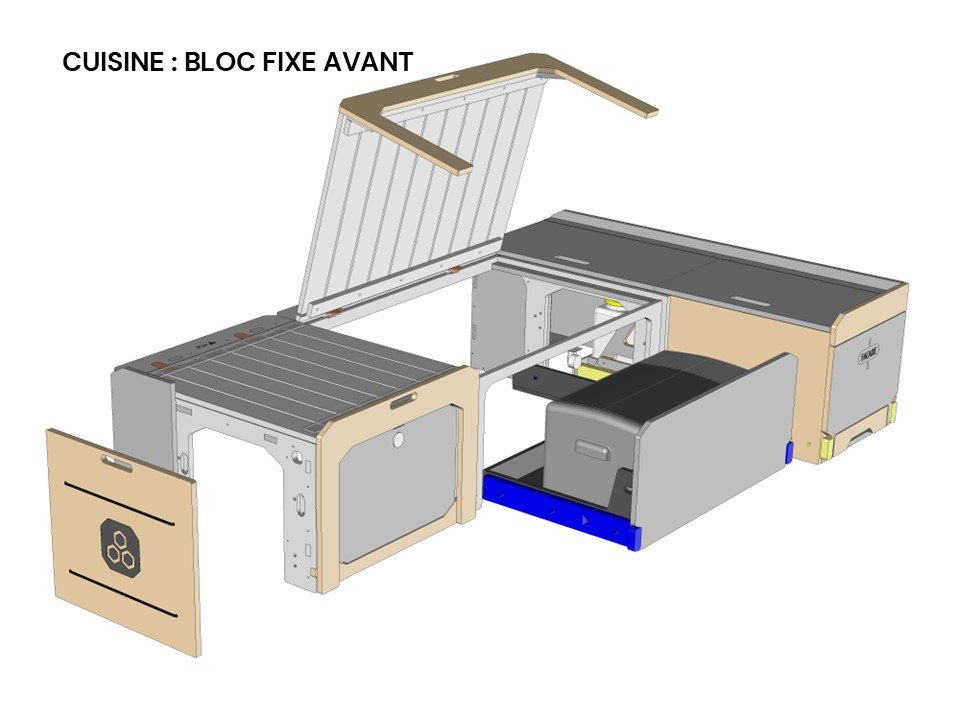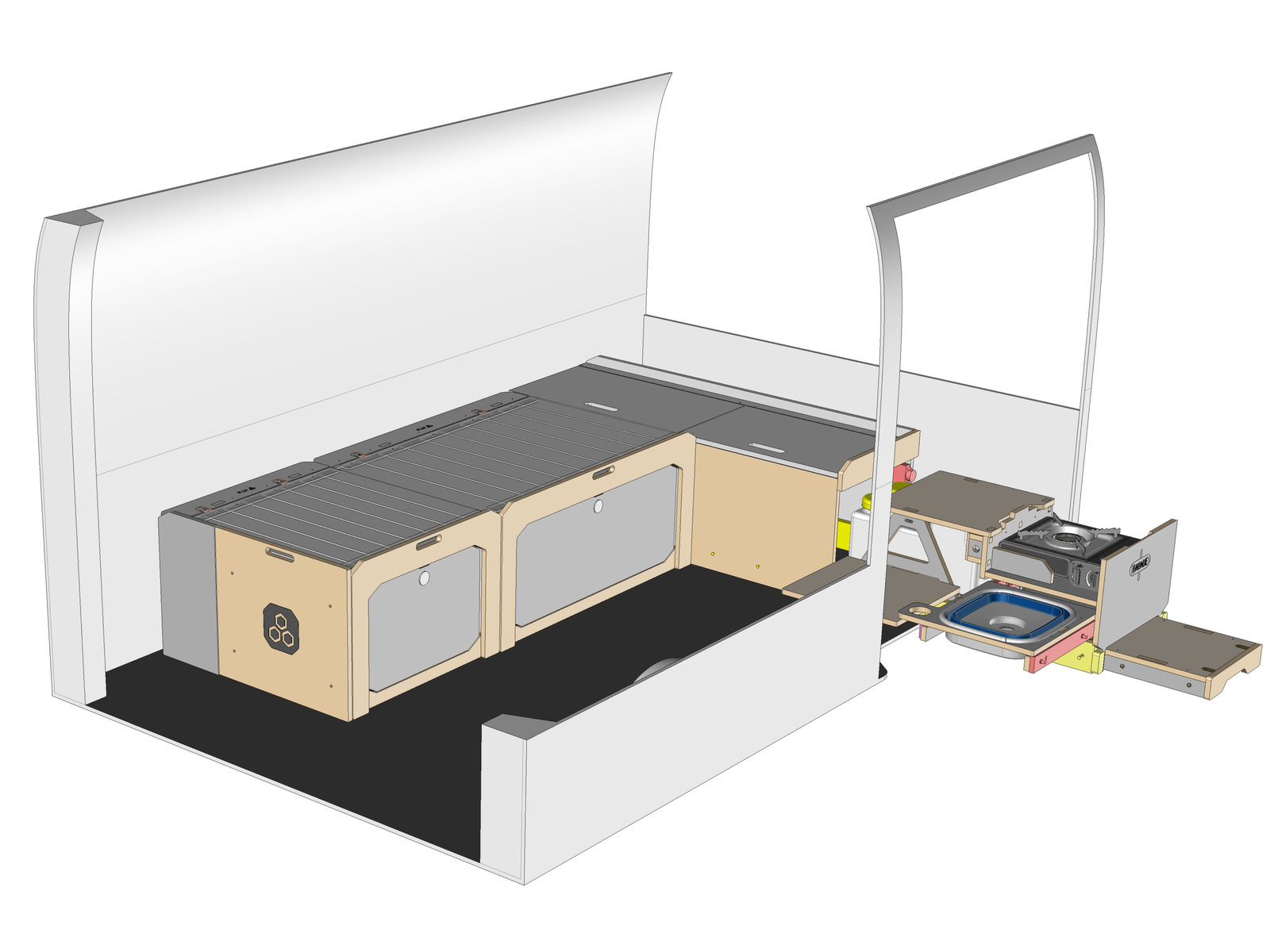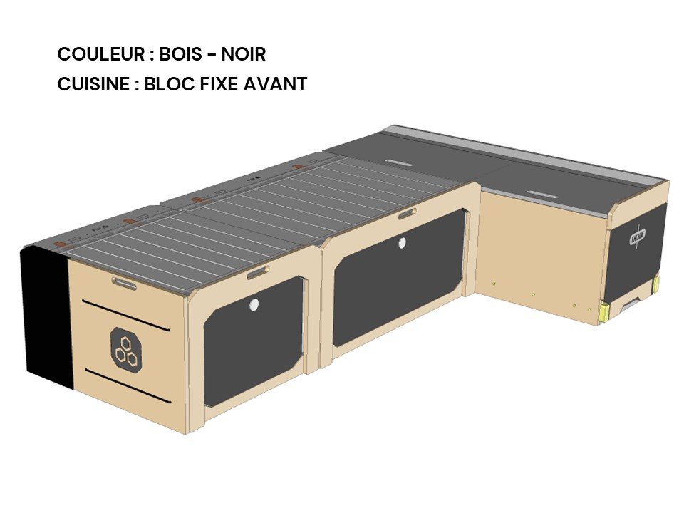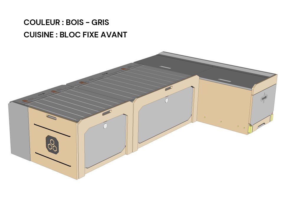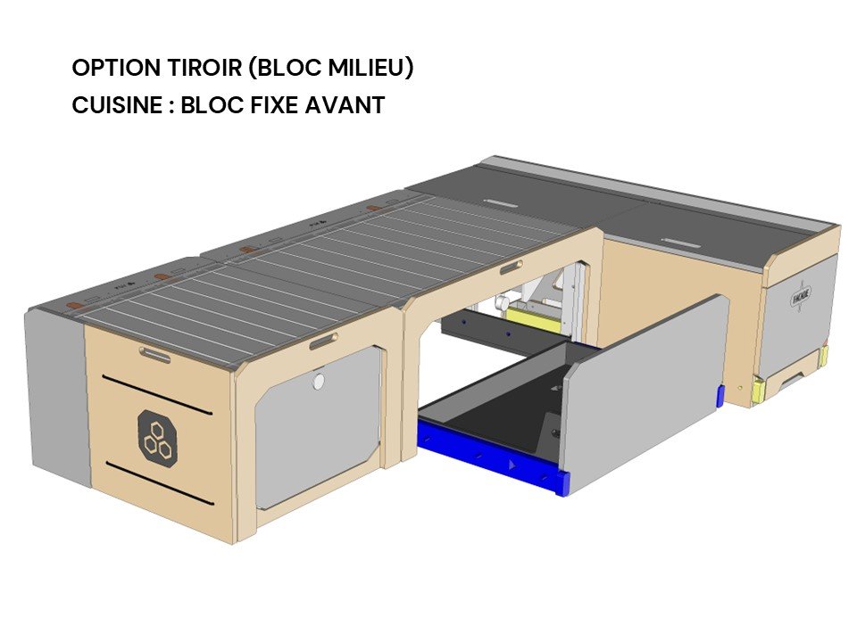 Ces options permettent de créer un aménagement complet : couchage + cuisine + eau + cuisson + froid