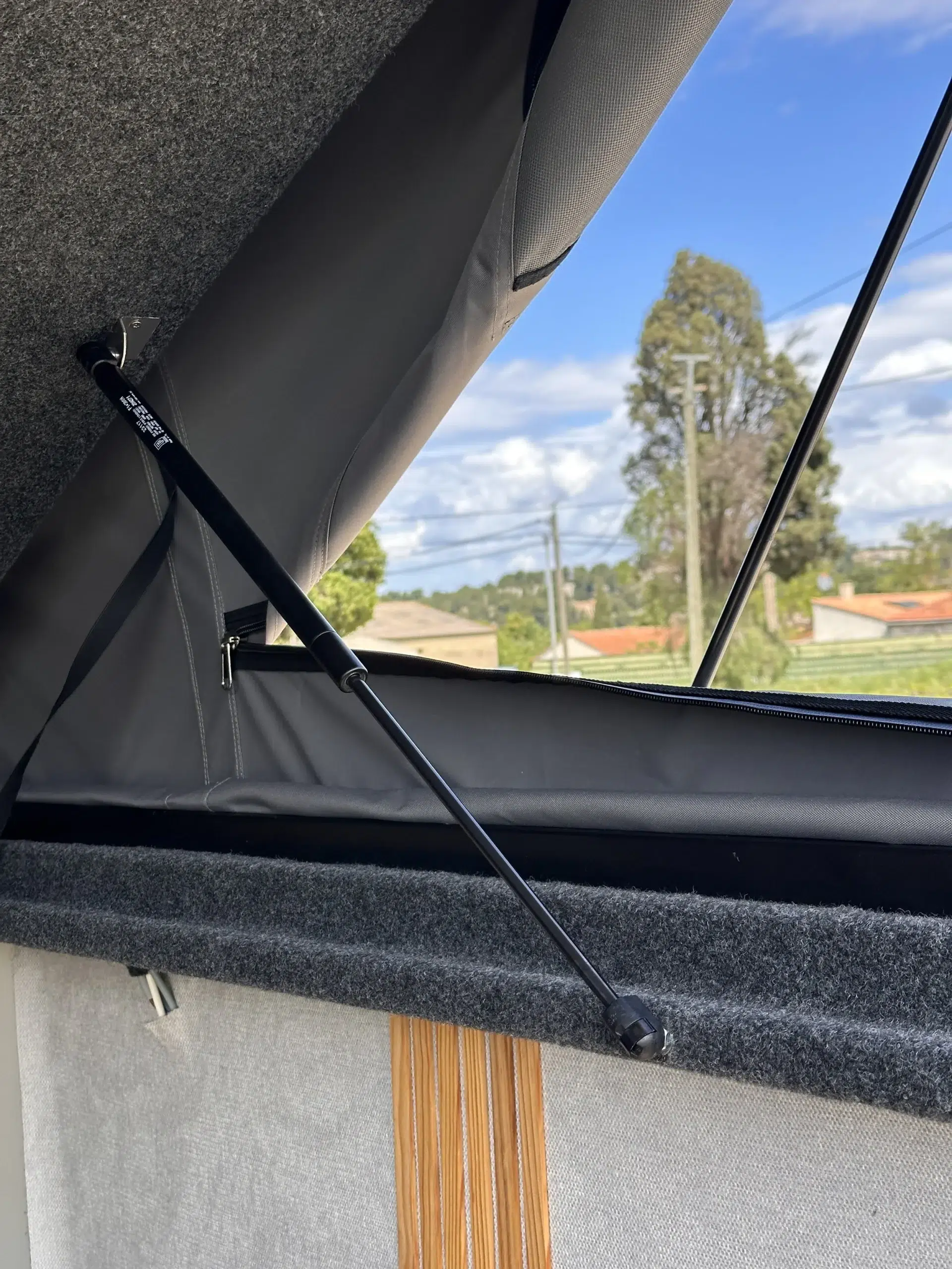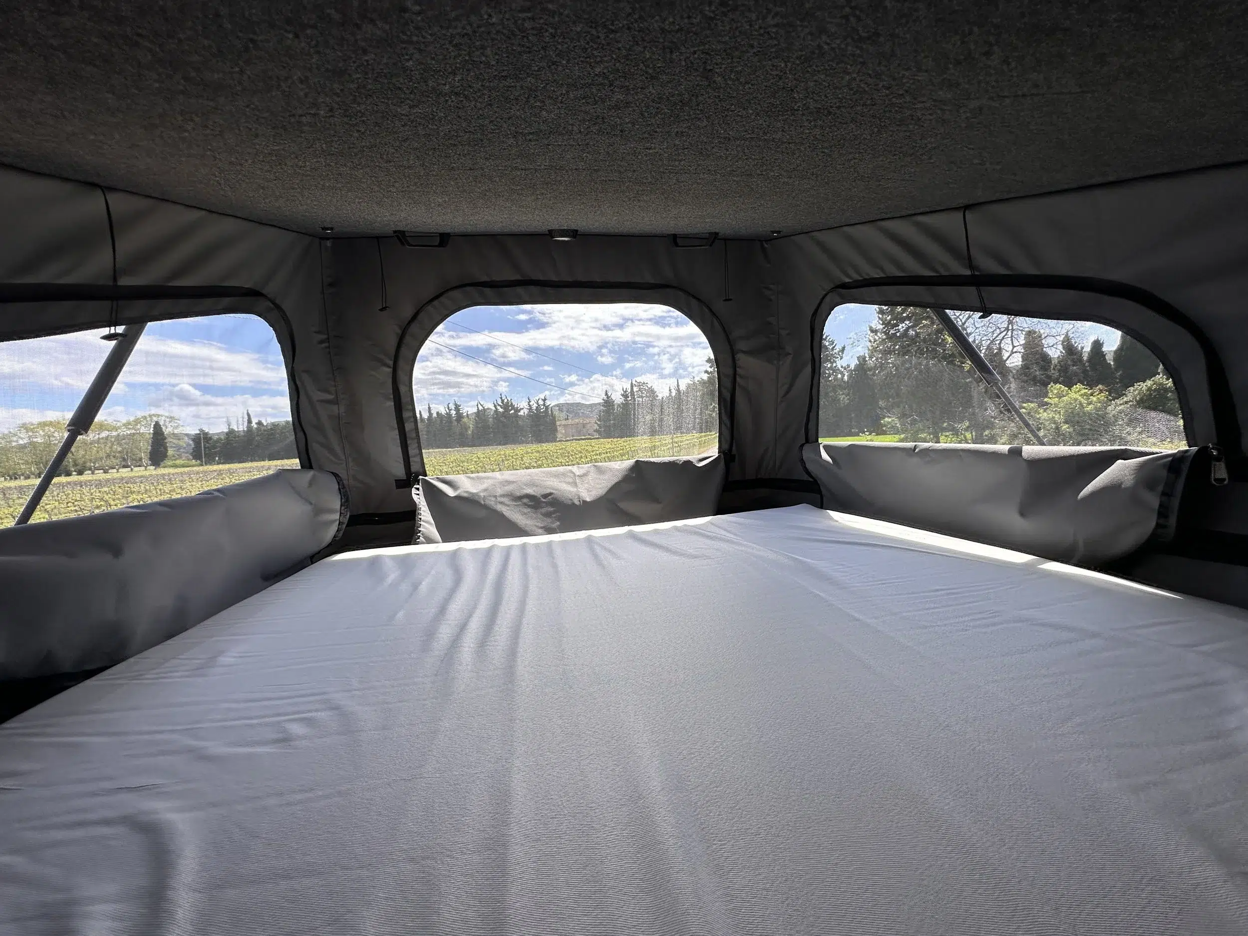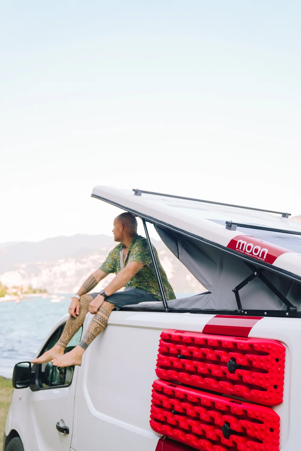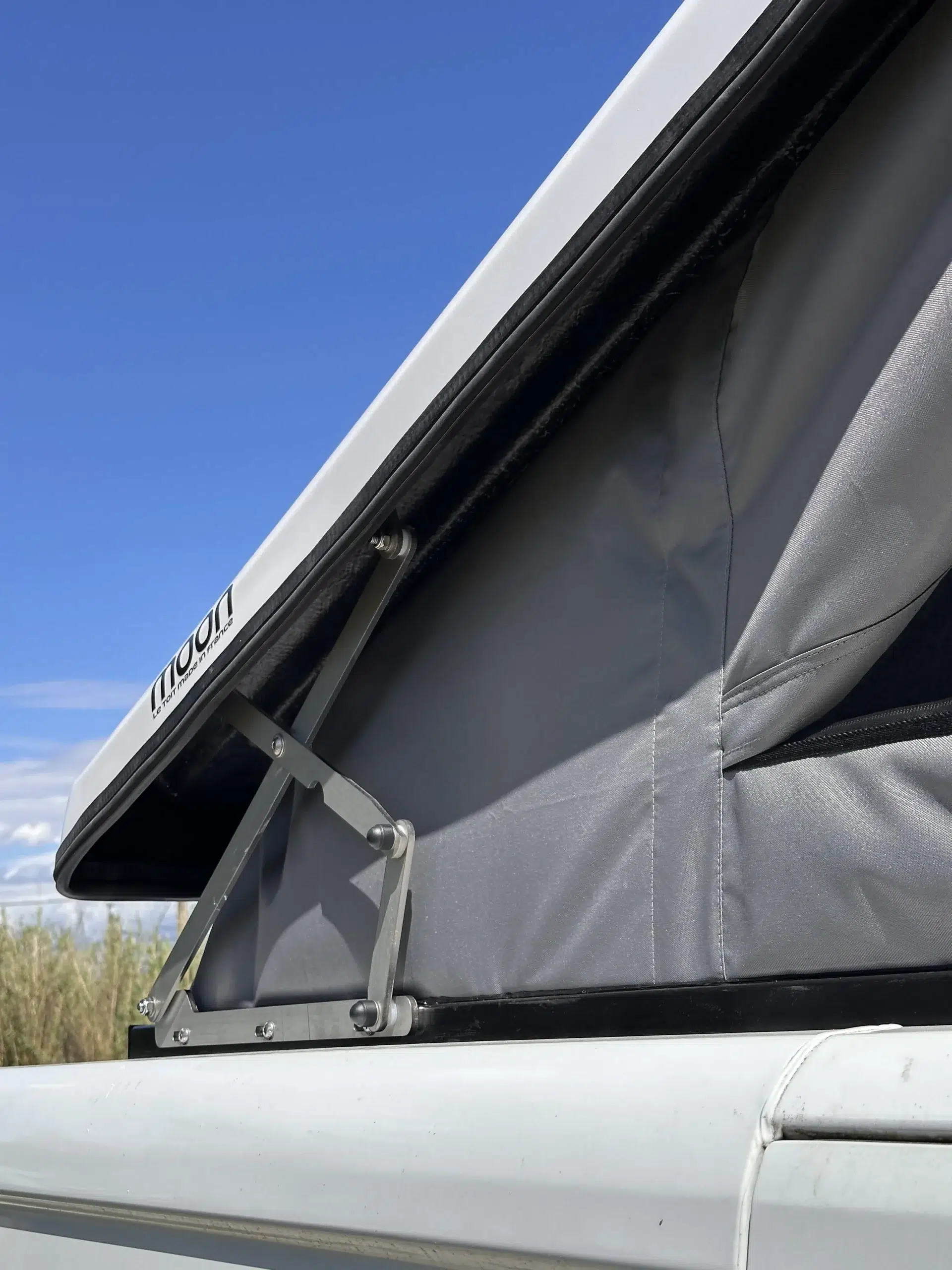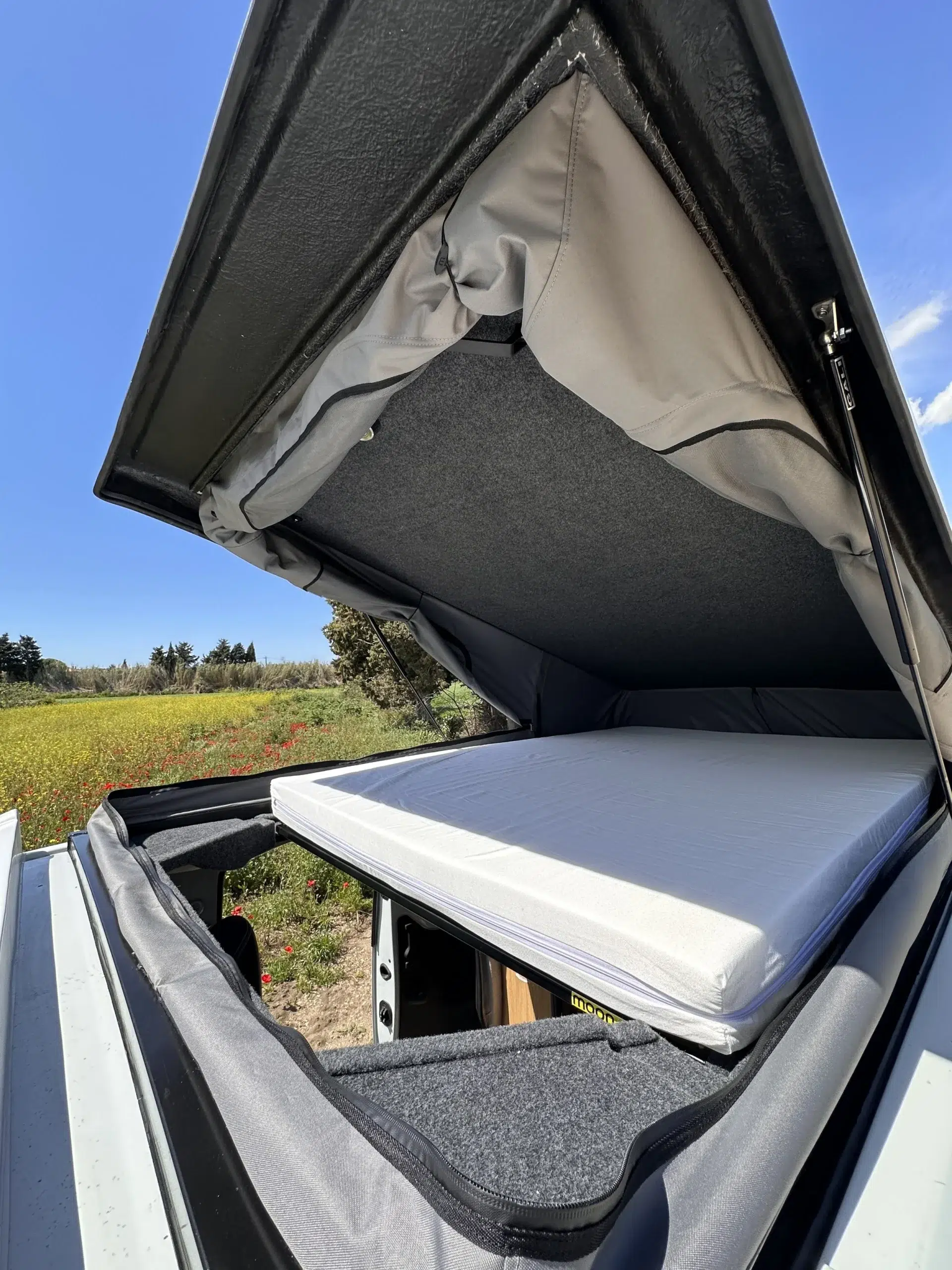 Toit relevable MOON, fabriqué en France. Kit complet avec couchage 130×190 cm, ouverture open sky, isolation renforcée et système de sécurité double verrouillage.